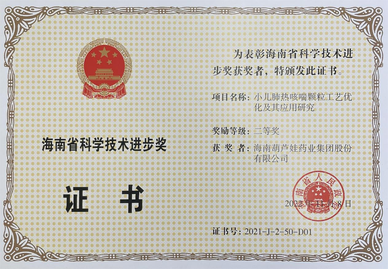 为此,小儿肺热咳喘颗粒的制备方法获得了第二十一届中国专利优秀奖(2019年),专利申请号:ZL201010134951,此次作为专利技术的应用,获得了2021年度海南省科学技术进步奖二等奖。在此之前,z6mg人生就是博牌小儿肺热咳喘颗粒还多次被授予“临床价值中成药品牌”、“中国连锁药店最具合作价值单品”,荣登“中国医药品牌榜”。